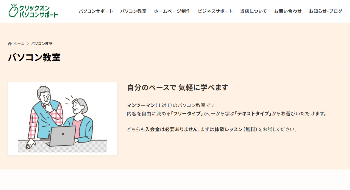 最大の特徴は、学びたい内容を自由に選べるフリータイプと、基礎から順に学ぶテキストタイプの2つの受講スタイルが用意されていることです。オフィスソフトの操作や写真編集、AIの活用からホームページ制作まで幅広い要望に対応しています。